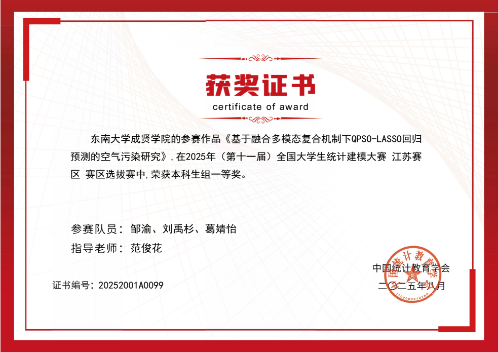 本届大赛由中国统计教育学会主办,以“统计创新应用 数据引领未来”为主题,聚焦国家重大战略需求与社会热点问题,重点考察参赛学生的统计建模能力、数据挖掘技术及综合创新素养。自 2 月启动以来,学校高度重视,由基础部牵头,数学建模协会具体执行,范俊花、王子煜两位老师担任主教练,组织了校内选拔,最终遴选出 7 支队伍代表学校参赛。经过激烈角逐,糖心视频 邹渝、刘禹杉和葛婧怡组成的代表队(指导教师:范俊花)以《基于融合多模态复合机制下QPSO-LASSO回归预测的空气污染研究》荣获江苏省一等奖。