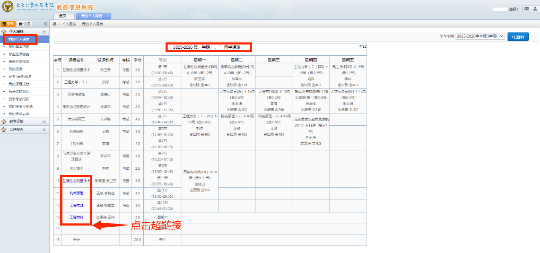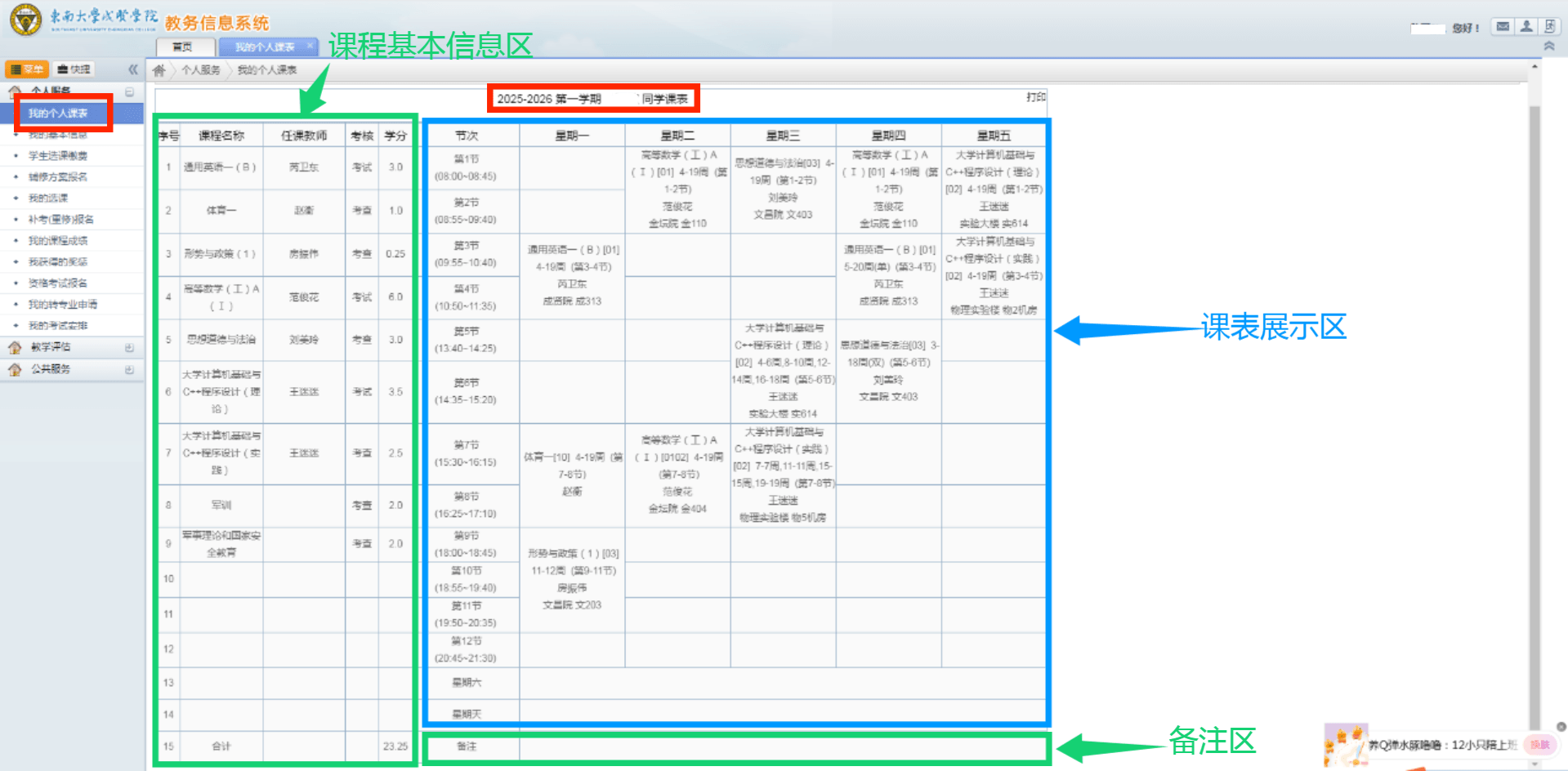 1.点击左侧列表“个人服务”下“我的个人课表”,查看对应2025-2026第一学期个人课表。学生个人课表有3个区域,当学生所选课程超过14门时,超出课程会显示在最后一行的备注区域内,如图4所示