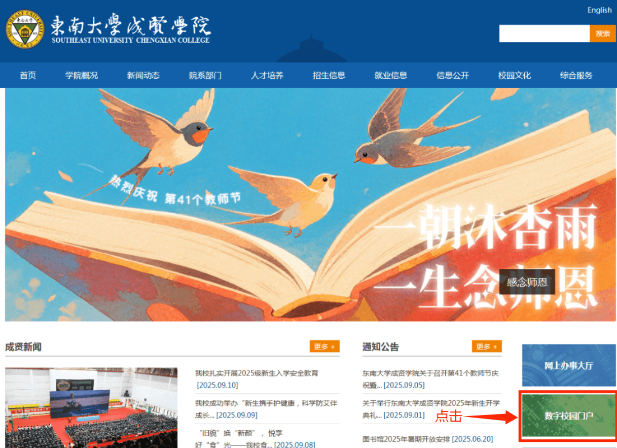 一、登录学校官网,网址://sugarsp.com/,点击“数字校园门户”