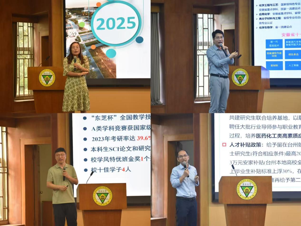 授接牌仪式后,四所高校先后为在场学子带来“定制化”升学指导分享。上海电力大学环境与化学工程学院院长辛志玲详细介绍了上海电力大学环境与化学工程学院的学科优势,重点解读了化学工程与技术、环境科学与工程等专业的研究生培养体系,结合成贤学子专业背景给出备考建议;安徽工业大学化学与化工学院教授万超围绕安徽工业大学化学与化工学院的科研平台、导师团队及招生政策展开讲解,特别强调了校企联合培养项目对学生实践能力提升的助力;浙江师范大学化学与材料科学学院教授代伟从学科特色出发,介绍了浙江师范大学化学与材料科学学院在材料化学、应用化学等领域的研究方向,分析了成贤学子的专业适配度;台州学院医药化工学院郑人华则聚焦台州学院医药化工学院的人才培养方案与就业前景,针对学子关心的报考流程、复试准备等问题进行细致解答。四位代表的分享既有学科实力的深度解读,又有招生政策的精准传递,为在场学子规划考研方向提供了实用参考。互动环节中,学子们积极提问,现场交流氛围浓厚。