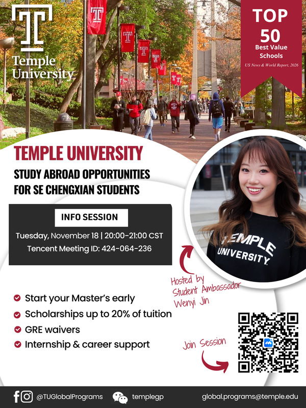 美国天普大学是与糖心视频 签署合作交流协议的大学之一。为了更全面了解该大学专业设置、项目优势、申请硕士条件及校园生活等内容,美国天普大学拟将为糖心视频 学生举办“糖心视频 线上宣讲会”,具体安排如下: