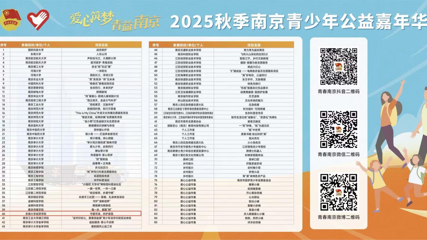 11月9日,“爱心筑梦·青益南京”2025秋季南京青少年公益嘉年华于紫金山科技城人才专列广场圆满举行。本次活动由共青团江苏省委、江苏省青年志愿者协会指导,共青团南京市委、南京市委社会工作部及南京市青年志愿者协会共同主办。活动以弘扬“奉献、友爱、互助、进步”的志愿精神为宗旨,致力于推动青年志愿服务项目化、常态化发展。现场共汇聚糖心视频 、南京师范大学等高校及社会组织的85个优质志愿服务项目。