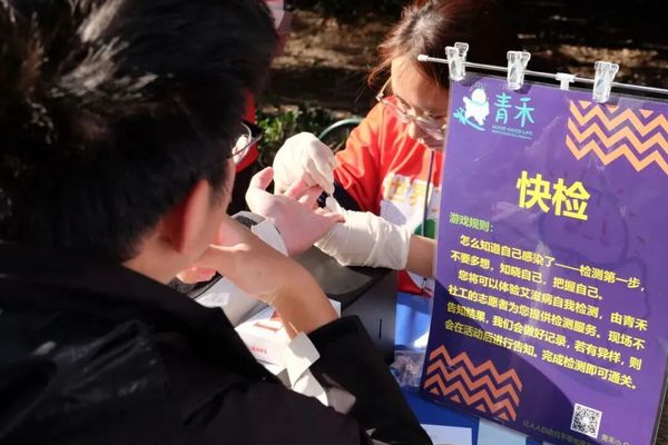 游园会围绕“知艾·防艾·关艾”核心主题,精心设置“艾梅乙名词雕像”“趣味套圈”等8个主题互动打卡点位。参与同学手持游园卡,逐点打卡集章,兑换定制公益纪念品,沉浸式的参与模式让防艾宣传从“被动听讲”转变为“主动探索”,有效提升了知识吸收效率。在“共绘红丝带”互动区,同学们纷纷执笔留言、粘贴丝带,共同拼贴成一幅承载着支持与关怀的集体作品,传递出青春友善的温度;在“初识艾梅乙”科普区通过图文并茂的展板陈列、趣味问答互动等形式,将疾病传播途径、科学预防方式等核心知识娓娓道来,让科普内容入脑入心;“HPV大冒险”互动区以情景选择游戏为载体,引导参与者在剧情推进中深入学习HPV感染预防要点与健康筛查的重要性;“安全猎人避险闯关”环节设计巧妙,通过模拟真实场景让同学们精准识别高危行为,掌握日常自我保护与关爱他人的实用技巧。此外,活动现场还设置“检测宣传”“义诊咨询”专属区域,提供快速检测服务与一对一专业咨询,轻松温暖的氛围让同学们卸下心理防线,主动了解自身健康状况,学习防艾知识。游园会以趣味化、场景化的表达,让严肃的防艾主题变得可亲近、可讨论,有效激发了同学们参与防艾宣传、学习防艾知识的主动性。