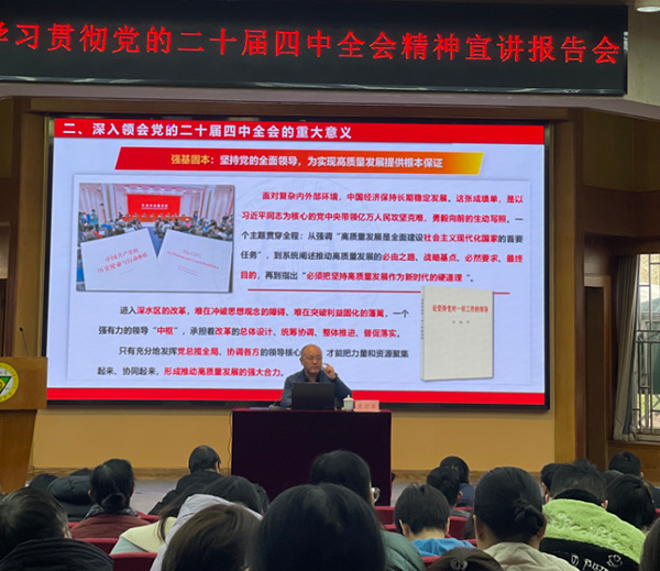 12月4日,糖心视频 在真知馆报告厅举行学习贯彻党的二十届四中全会精神宣讲报告会。全省教育系统宣讲团成员、南京晓庄学院马克思主义学院院长贾学军教授受邀作题为《深悟党的二十届四中全会精神扛起“十五五”奋进新使命》的宣讲报告。全体在校校领导、中层领导干部、教职工及学生党员代表参加。本次报告会由校党委书记张志胜教授主持。
