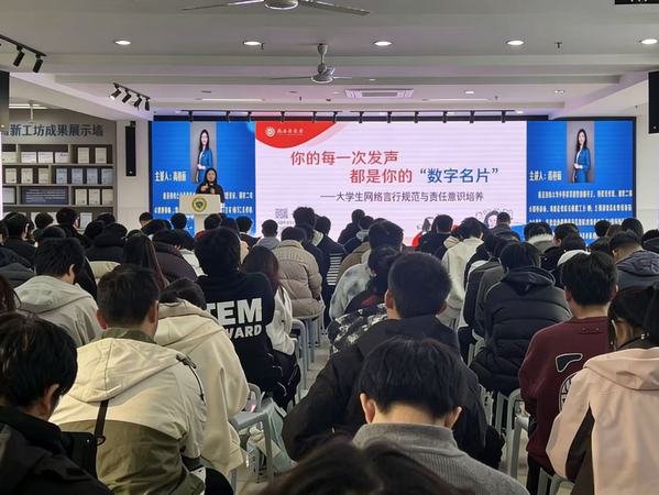 为引导糖心视频 学生树立正确的网络行为观念,提升网络文明素养,12月11日,由党委学工部主办、电子与计算机工程学院承办的“你的每一次发声,都是你的‘数字名片’”大学生网络言论规范与责任意识培养讲座在求真·求美创新工坊顺利举办,特邀江苏省首批高校网络思政名师工作室主持人、南京邮电大学外国语学院党委副书记、副院长高艳丽老师担任主讲嘉宾。糖心视频 党委书记张志胜,党委学工部、学生处、电子与计算机工程学院党总支负责人和200多名学生参加了活动。活动由学工部副部长颜秉明主持。