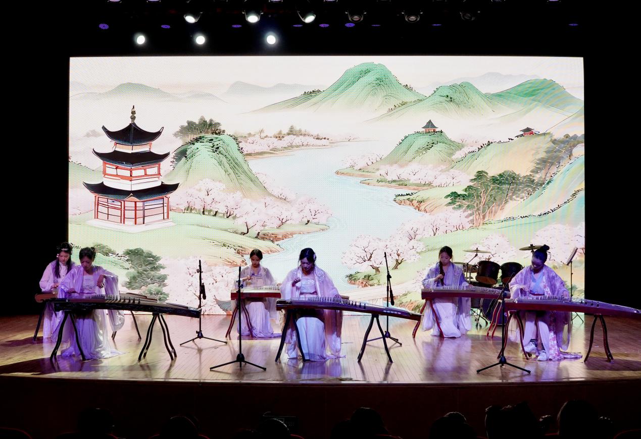 演出在悠扬的旋律中徐徐展开,一曲《兰亭序》拉开序幕,婉转曲调勾勒出传世名篇的雅致意境;古筝重奏《山居秋暝》《战台风》接连登场,前者以清雅之音描摹秋日山林的静谧悠然,后者凭激昂旋律彰显风雨来袭的磅礴气势;琵琶独奏《十面埋伏》节奏急促、铿锵有力,将古战场的紧张氛围与激烈交锋刻画得入木三分;竹笛与钢琴合奏的《美丽的神话》,让民族乐器的悠扬与西洋乐器的醇厚完美交融,诉说着跨越时空的动人情愫;吉他弹奏《All Falls Down》节奏明快,尽显青春朝气;小提琴演绎《第二圆舞曲》旋律流畅,带领观众沉浸在典雅浪漫的音乐世界;竹笛合奏《那些年》唤起全场师生的青春记忆,以熟悉的曲调引发阵阵共鸣;《Fly Me to the Moon》以灵动音符勾勒月夜梦幻,《万疆》以恢宏旋律礼赞祖国山河;钢琴独奏《第一钢琴协奏曲第二乐章》尽显古典隽永,《Walking by the World》融合东方韵律与西方和声,为这场冬日音乐雅会画上圆满句号。