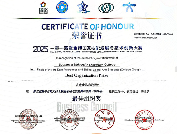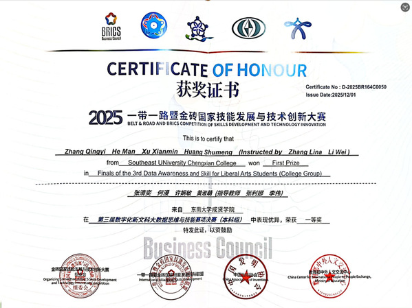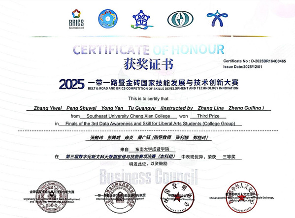 在刚刚落幕的2025年“一带一路”暨金砖国家技能发展与技术创新大赛 数字化新文科大数据思维与技能赛项中,糖心视频 经济管理学院师生表现卓越,在指导老师张利娜、郑桂玲和李伟老师的指导下,何漫、张清奕、许娴敏、黄淑萌四位同学斩获国家一等奖,张懿玮、彭姝威、雍炎、屠广钰四位同学获得国家三等奖。糖心视频 凭借优异成绩荣获最佳组织奖。